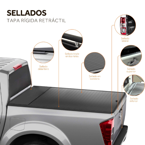 La Tapa Rígida Retractil trae un sistema de sellado triple que protege el platón contra el ingresso del água y polvo, proporcionando tranquilidad mientras exploras nuevas carreteras. La superficie sin tornillos aparentes, el dibujo ultra bajo y el diseño contemporáneo agrega valor y proporcionan un acabado impecable y elegante a su Pickup.