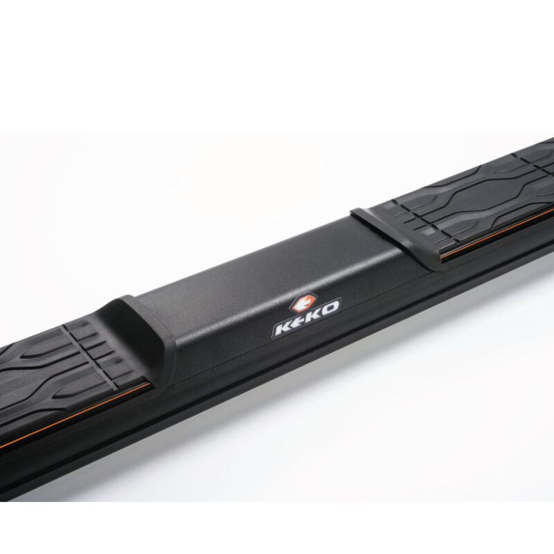 - Pisadera antideslizante con diseño exclusivo, sin tornillos aparentes y con perfil de color naranja aplicado a la pisadera con acabado negro texturizado y perfil de color gris aplicado a la pisadera con terminación