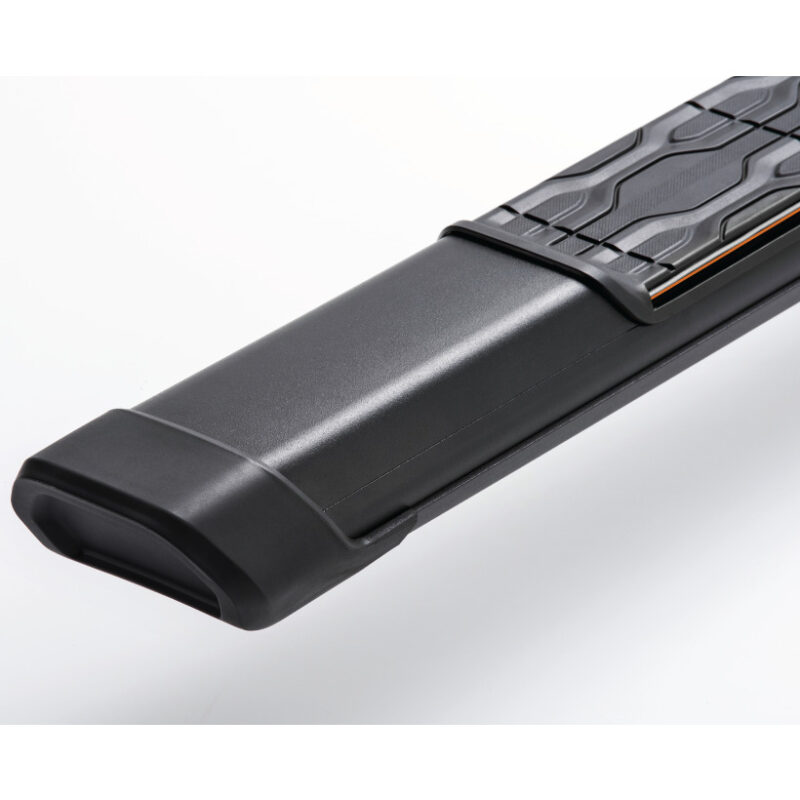 - Pisadera antideslizante con diseño exclusivo, sin tornillos aparentes y con perfil de color naranja aplicado a la pisadera con acabado negro texturizado y perfil de color gris aplicado a la pisadera con terminación